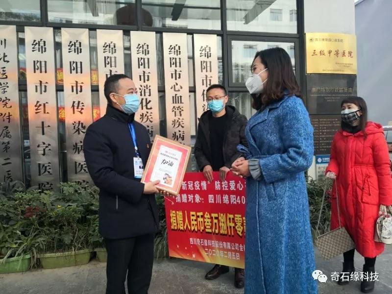 一線抗疫“最可愛的人”讓我們心生敬意。電視、報(bào)紙及網(wǎng)絡(luò)媒體相繼報(bào)道他們的動(dòng)人故事,奇石緣科技工會(huì)第一時(shí)間發(fā)出聲音,向全體員工倡儀,向四?四醫(yī)院捐款,你一百、他二百……員工們立即在工會(huì)群里捐款接龍,積極響應(yīng),一天時(shí)間內(nèi)公司與員工合捐金額38020元。2月5日,總經(jīng)理陳艷利、工會(huì)主席羅官一行來到綿陽(yáng)四?四醫(yī)院,代表董事長(zhǎng)湯世友及全體員工向廣大一線醫(yī)務(wù)工作者表示慰問和敬意,并送去了愛心捐款。院黨委書記周云在百忙之中接見公司慰問組,深情表達(dá)了對(duì)公司及全體員工的感謝。他表示,以奇石緣科技為代表的民營(yíng)企業(yè)發(fā)揚(yáng)“一方有難,八方支援”的精神,積極為抗擊疫情奉獻(xiàn)愛心、貢獻(xiàn)力量,展現(xiàn)民營(yíng)企業(yè)家的責(zé)任擔(dān)當(dāng)。