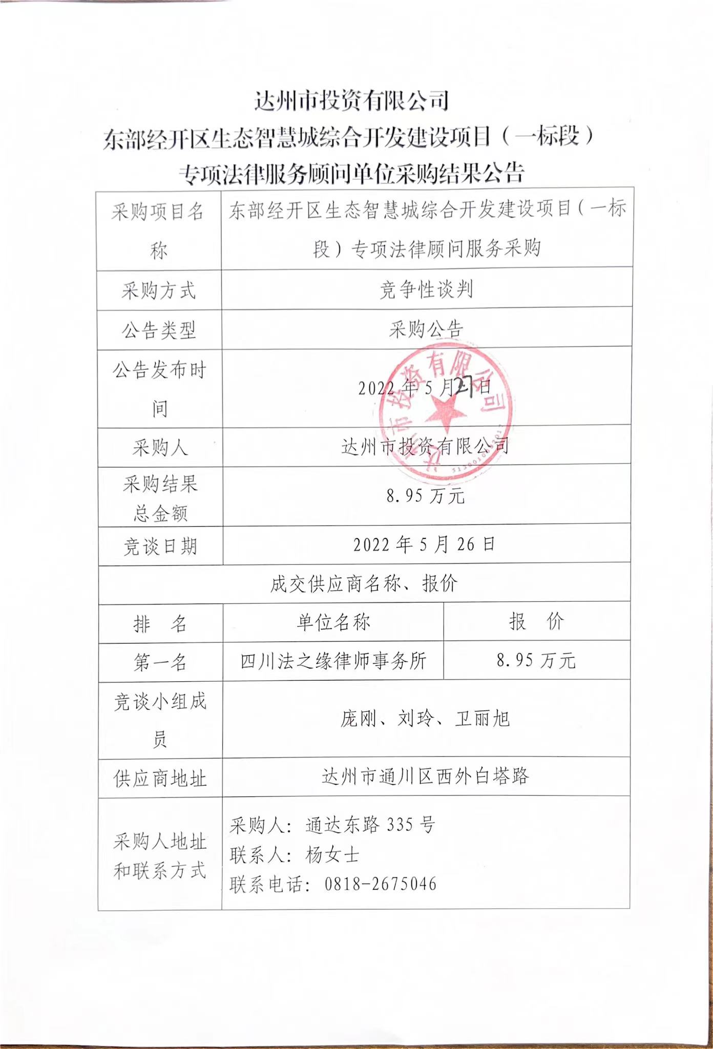 東部經(jīng)開區(qū)生態(tài)智慧城綜合開發(fā)建設(shè)項目(一標(biāo)段)專項法律服務(wù)顧問單位采購結(jié)果公告